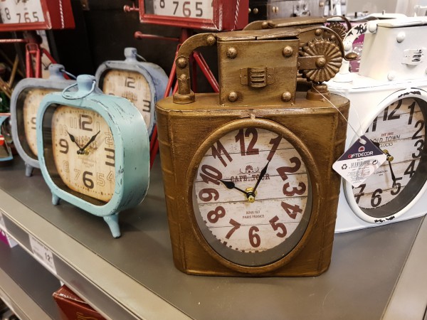 В Барселоне есть магазин под названием Conforama — там все для дома, все для семьи. И в нем есть отдел, в котором продают совершенно стимпанковые часы и другие предметы обихода. Часы, к сожалению, не на паровом ходу, но тем не менее — смотрите, какая прелесть. Прям страшно хотелось приобрести, но только некуда мне это поставить — у меня в кабинете все оформлено в тусклом офисном стиле, такие штуки там будут смотреться вызывающе.