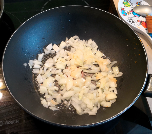 На сковородку наливаем оливкового масла, режем половинку репчатого лука и обжариваем. Лук лучше резать мелко, но мы с Бубликом режем как придется, потому что мелко — просто не умеем.