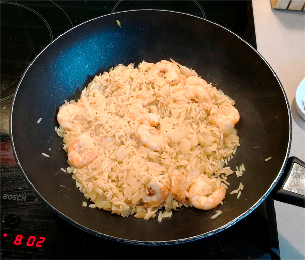 Рис промываем холодной водой, кладем на сковородку с луком, буквально минуту обжариваем, после этого заливаем двойным объемом (по отношению к рису: если было полстакана — значит, наливаем полный стакан) горячей воды. Также вместо воды можно использовать бульон — мясной или рыбный.