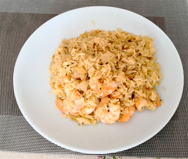 Креветки могут быть замороженные (но в этом случае покупать только очищенные), при этом их даже не обязательно размораживать — просто киньте как есть на сковородку в самом начале готовки вместе с луком. Они довольно быстро разморозятся и во вкусе особо не потеряют — я так делал несколько раз.