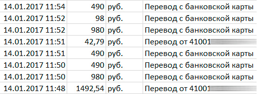 И Яндекс умеет делать выписку вот в таком виде. Там, правда, фигурирует немало переводов с банковской карты (от кошелька-то идентифицировать элементарно) и в отчете не пишется номер кошелька. Но там, соответственно, есть дата, минуты и секунды перевода, а также сумма до копеек. Тоже идентифицировать можно.