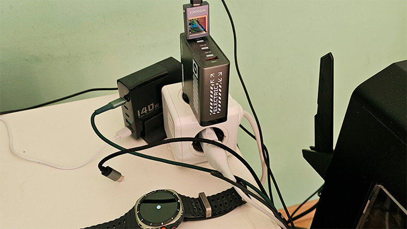 Вот полностью разряженные часы Samsung Galaxy Watch Ultra (я подождал, чтобы они набрали пару процентов заряда, чтобы вышли на полную мощность), заряжающиеся от фирменной зарядки из коробки от адаптера, поддерживающего мощность 140 Вт.