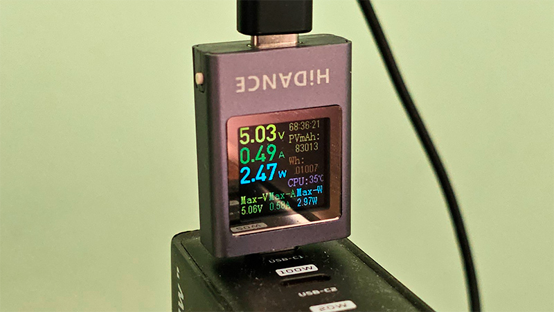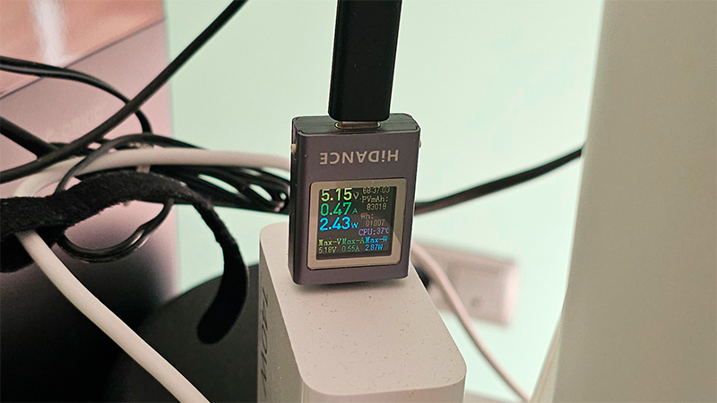 От другого адаптера, который на снимке, те же 2,4 Вт. Пару раз я видел, как при получении где-то 30% заряда мощность поднималась на пике аж до 3 Вт, но снова падала до 2,4 Вт.