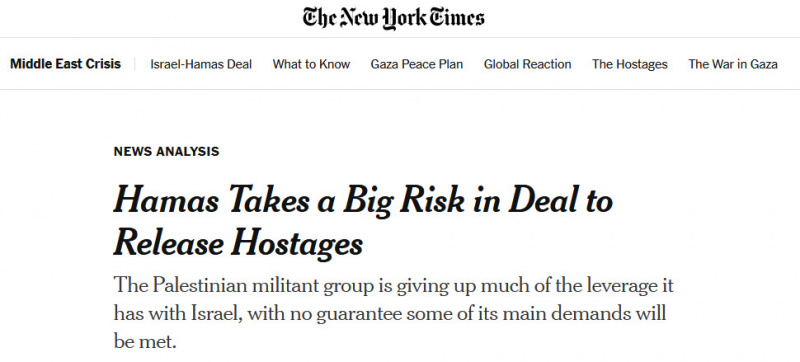 В издании The New York Times , что ХАМАС решил вернуть всех заложников. Рискуют они, говорят в издании. Надо было себе хотя бы десяток оставить, чтобы было чем дальше торговаться. А так — сплошные риски.